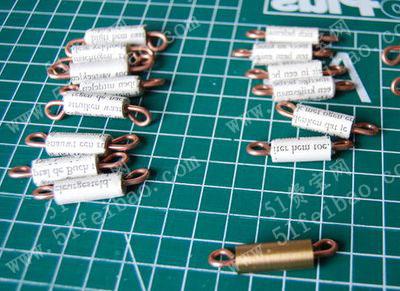 6、截短铜线,一头弯曲成回形钩,从另外一端的开放端捅入上一步卷好的废纸圆柱形纸珠。