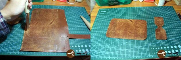 1、处理过的植鞣革,我用砂纸简单打磨了一下表面,不用打磨的很均匀,要得就是这个效果。打磨好以后按照纸板用水银笔画线。